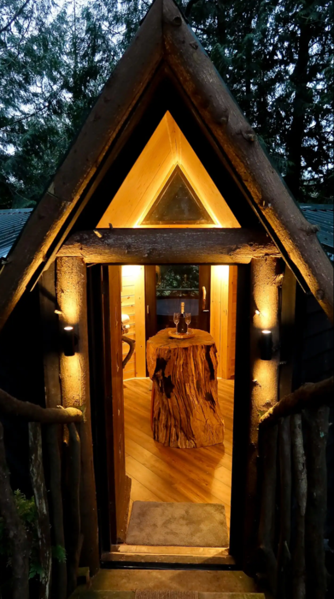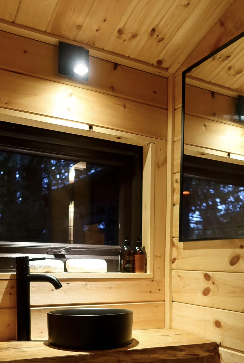 Hidden among tall pines and gently cradled by the trees, this off-grid lodge is designed for those who crave a quiet, restorative escape. Elevated above the forest floor and glowing softly with ambient light, it balances rustic charm with refined comfort — the perfect retreat for dreamers, couples, creatives, or solo explorers.