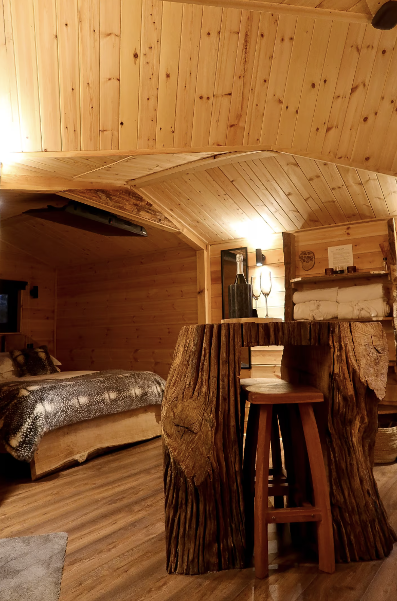 Hidden among tall pines and gently cradled by the trees, this off-grid lodge is designed for those who crave a quiet, restorative escape. Elevated above the forest floor and glowing softly with ambient light, it balances rustic charm with refined comfort — the perfect retreat for dreamers, couples, creatives, or solo explorers.